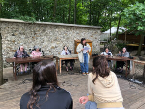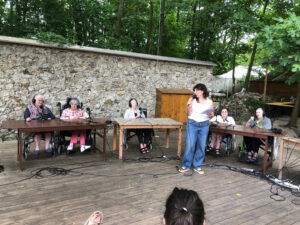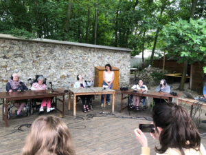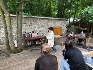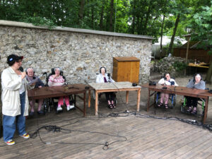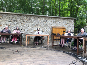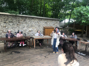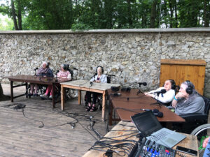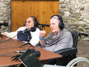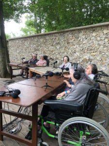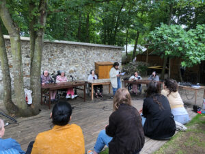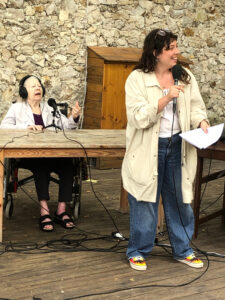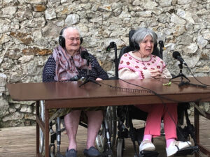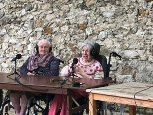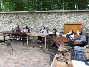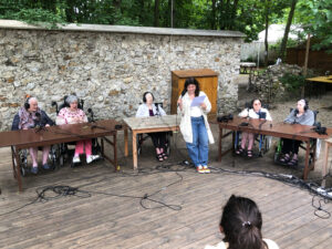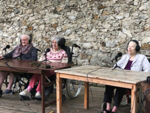 Bienvenue sur l’émission des résidentes de l’Ehpad des Beaux-Monts de Montreuil. Depuis décembre, Denise, Danielle, Micheline, Raymonde, Maria, Teresa (allias Tata Yoyo), Salvatrice, Josiane, Gisèle et les intervenant.es de Chronos&Kairos se retrouvent tous les mercredis après-midi pour créer des fictions radiophoniques. Toute l’équipe s’est retrouvée le 3 juillet pour l’enregistrement en public et en plein air d’une nouvelle émission de radio entouré de la nature luxuriante du théâtre de verdure de la Girandole, situé dans l’une des parcelle murs à pêches de Montreuil.